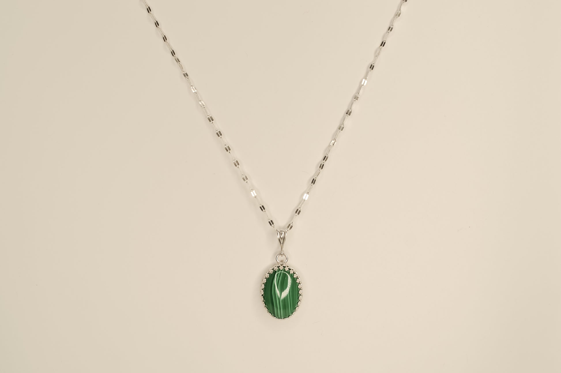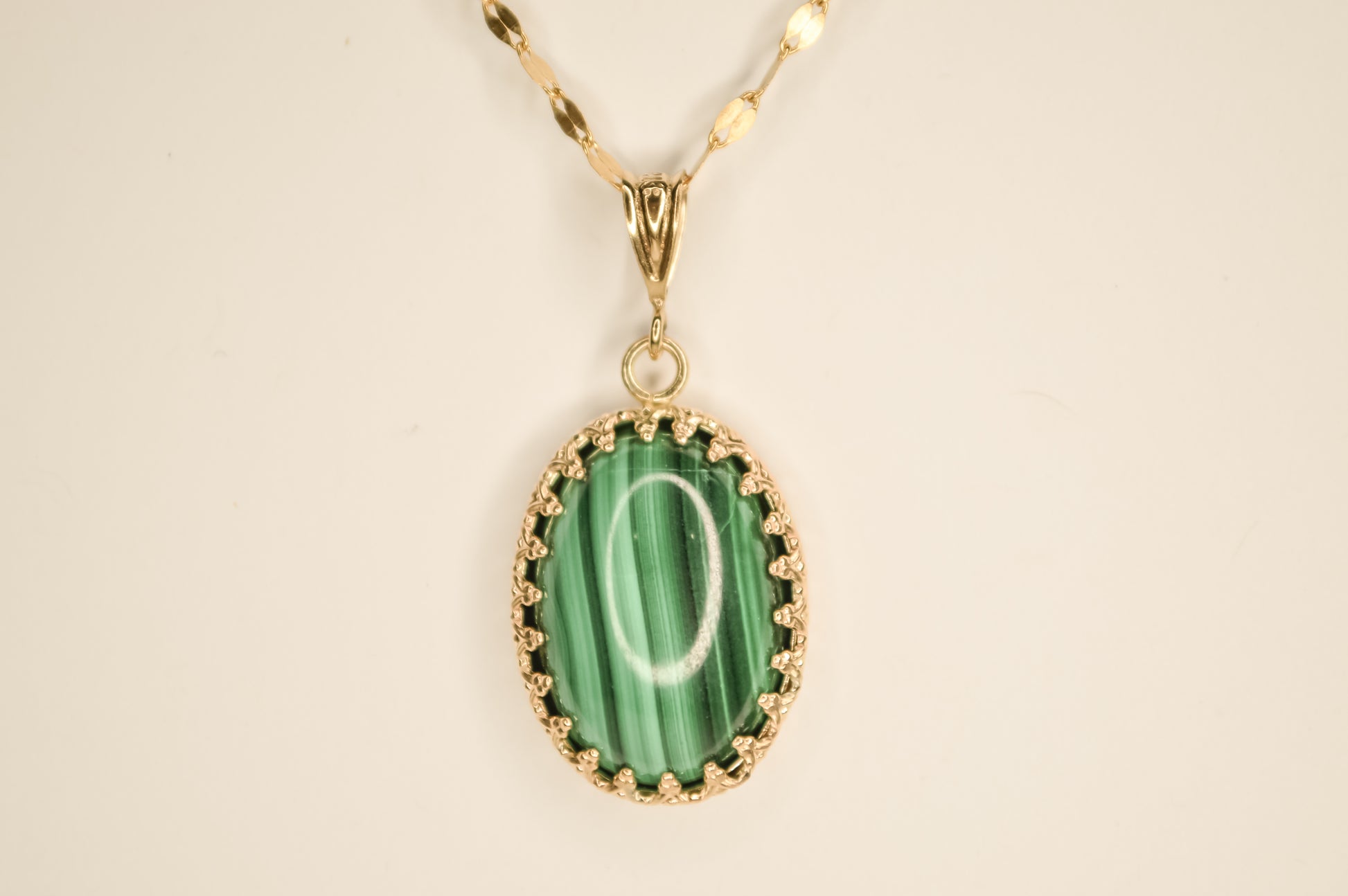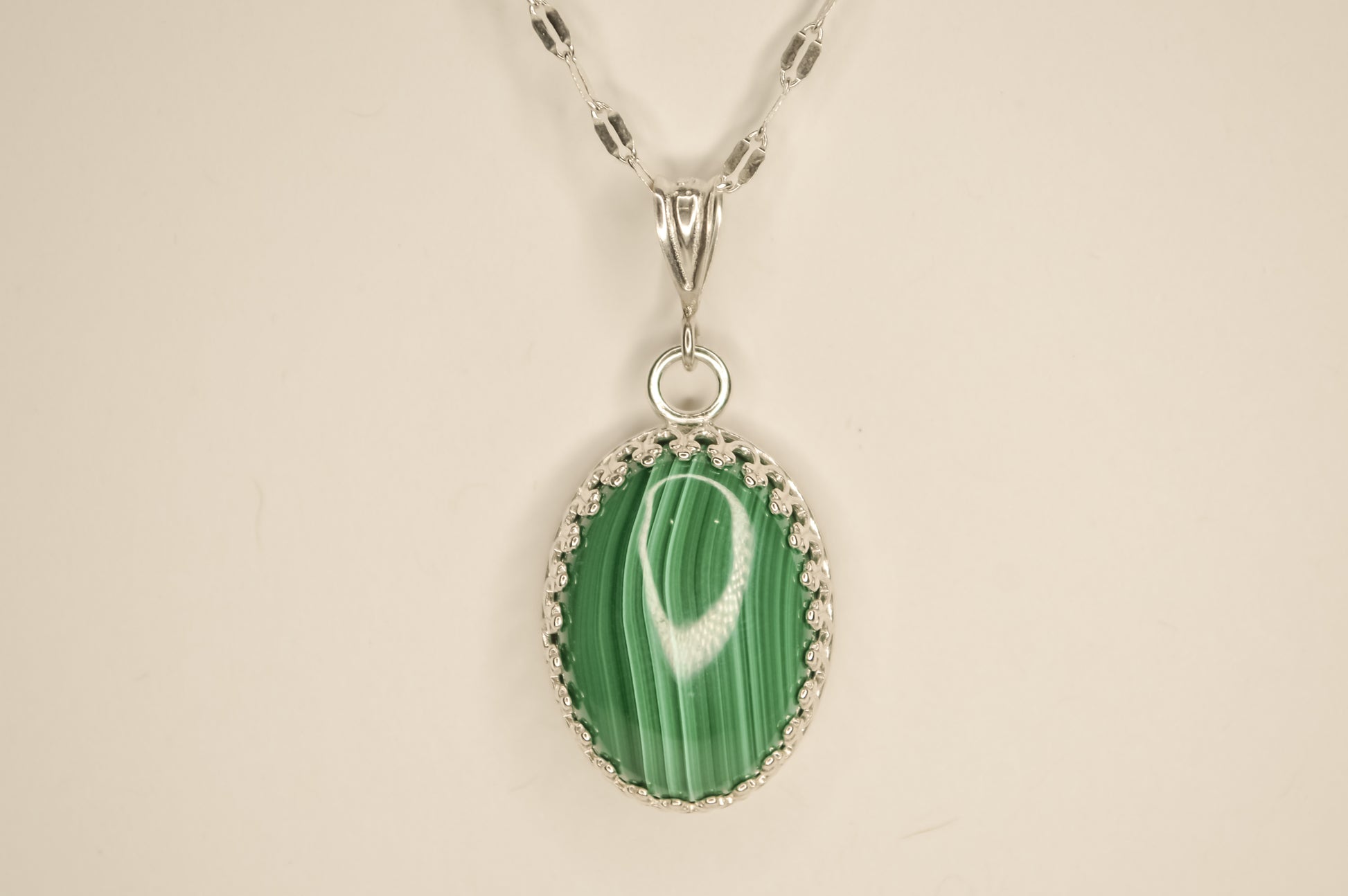 The genuine malachite stone is striking with its rich, green color and characteristic pattern. The stone is bezel-set with beautifully, detailed gallery wire and hung from an eye catching, glistening chain.