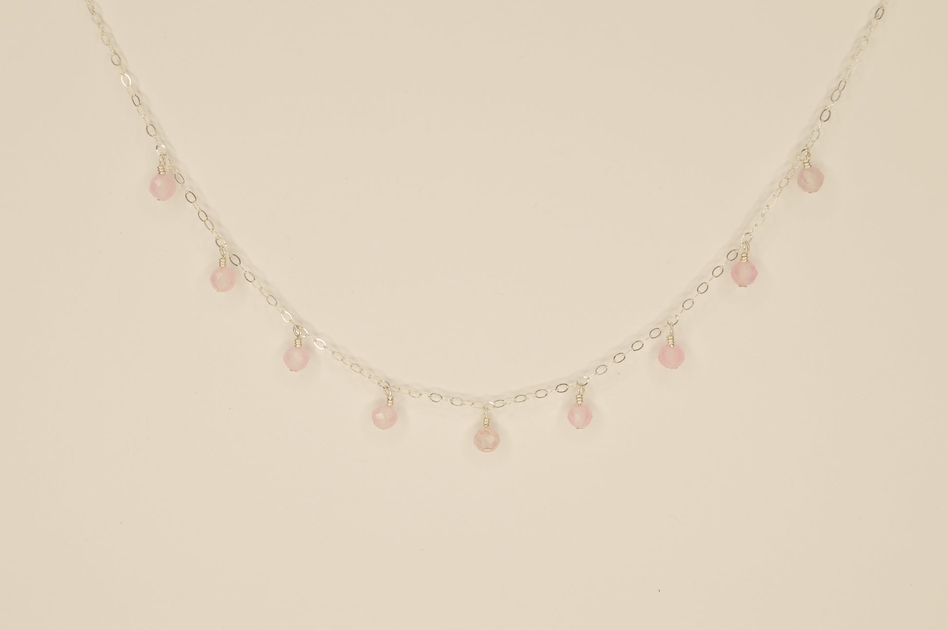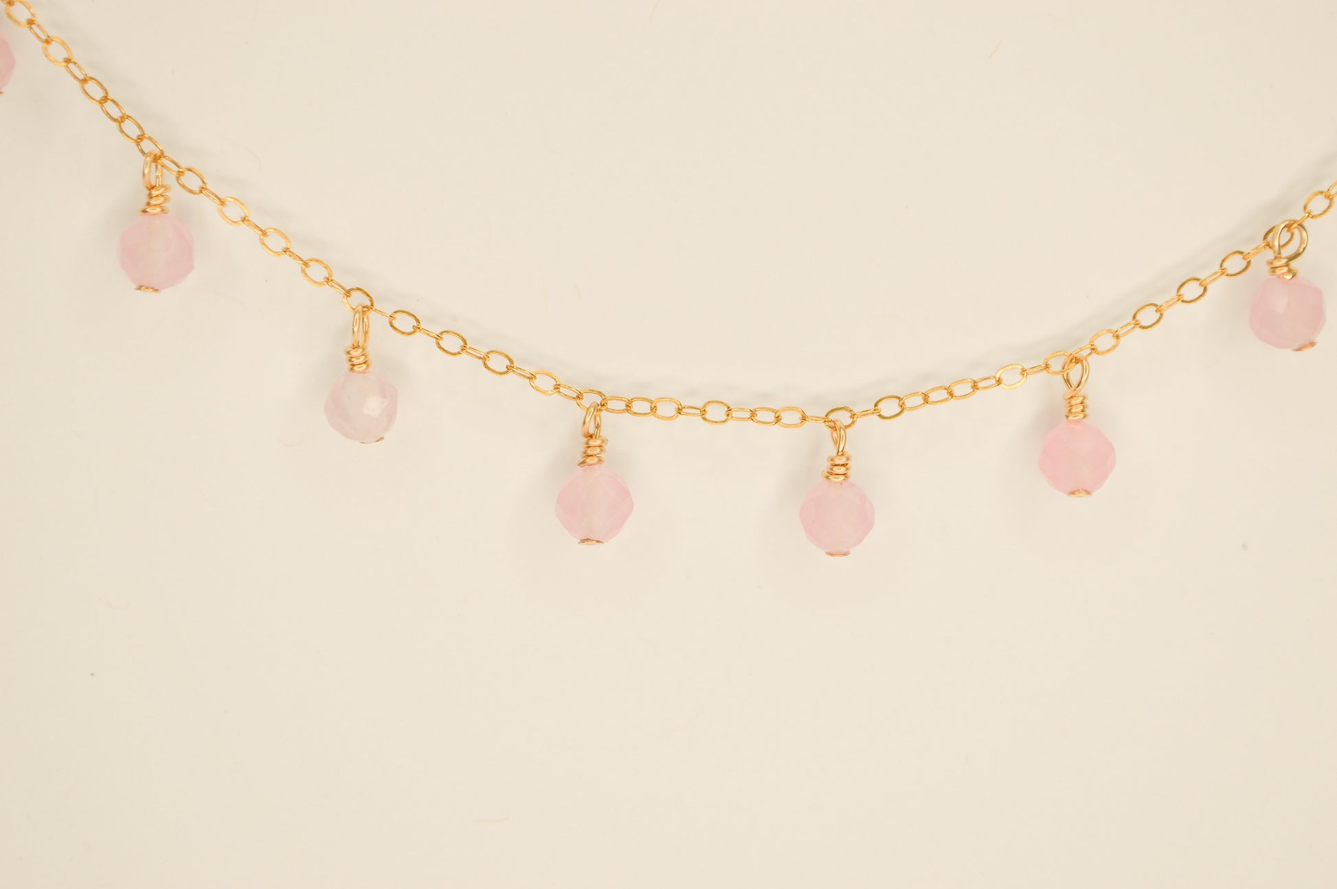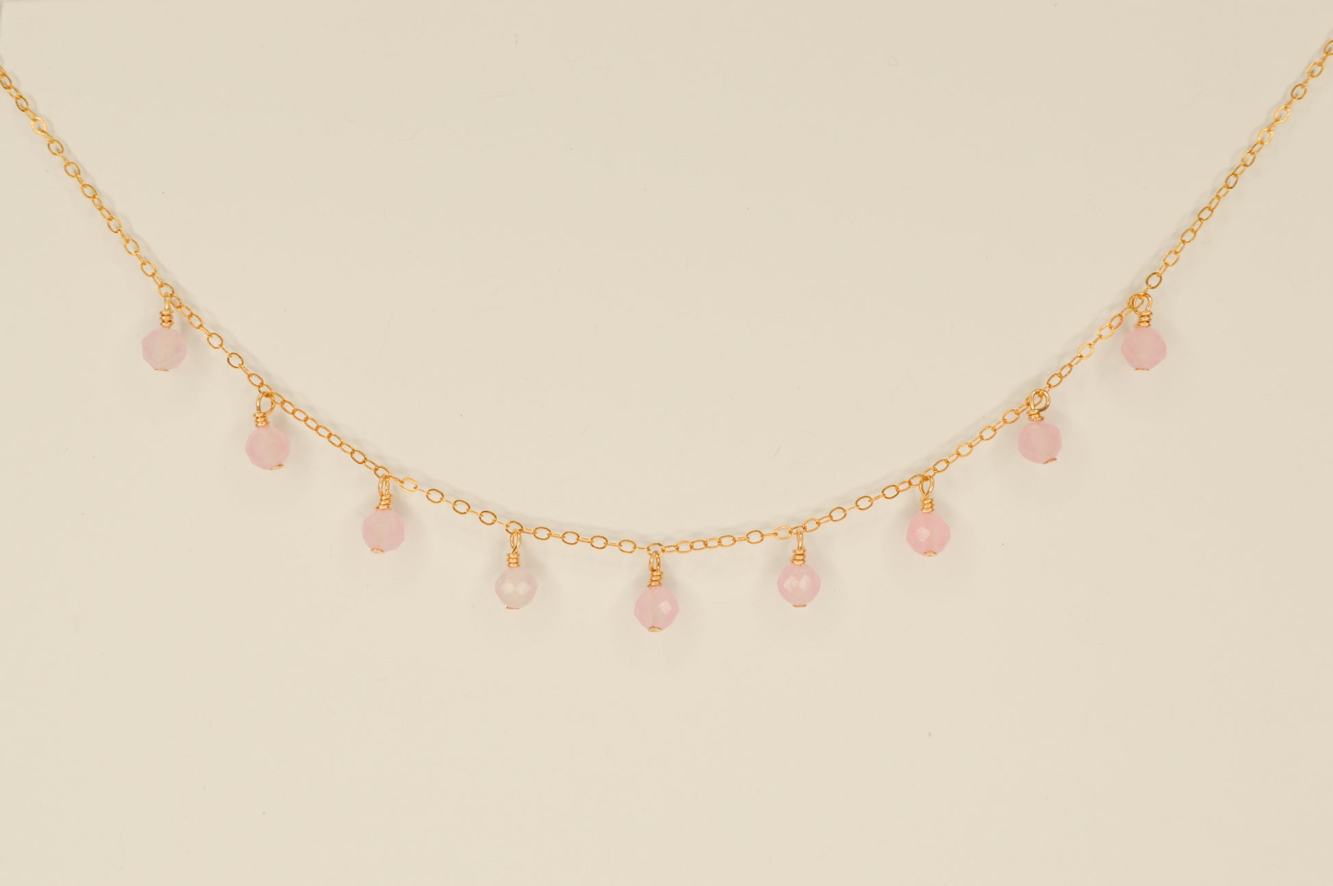 Add a touch of soothing elegance to your jewelry collection with our Princess Rose Quartz Necklace. This stunning piece features a delicate chain adorned with soft, blush-colored rose quartz beads that gently dangle and catch the light with every movement. Known as the stone of love, rose quartz promotes compassion, healing, and emotional balance, making this necklace not only a beautiful accessory but also a meaningful addition to your wardrobe.
