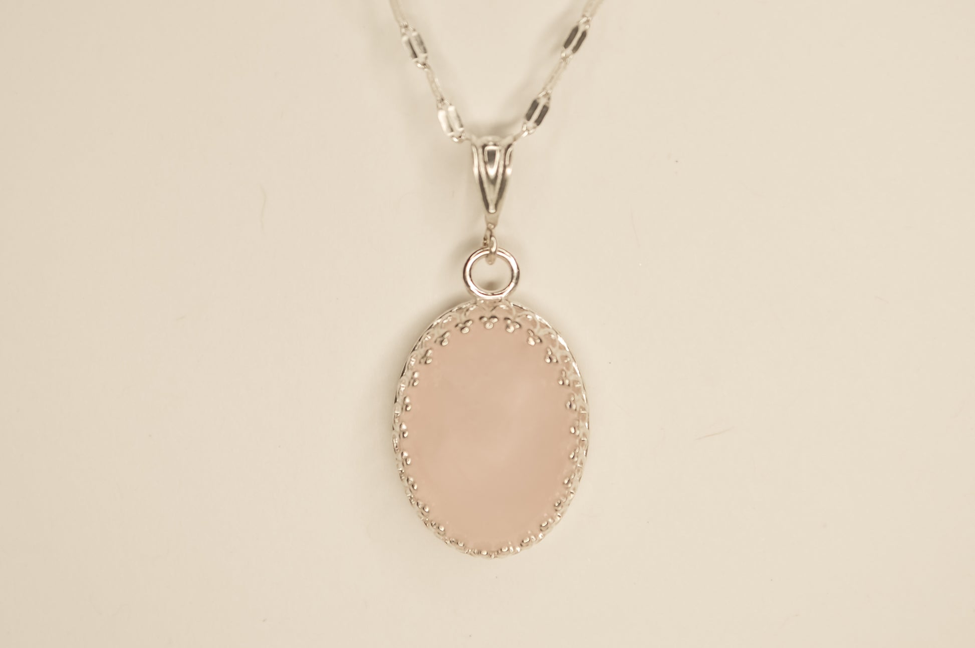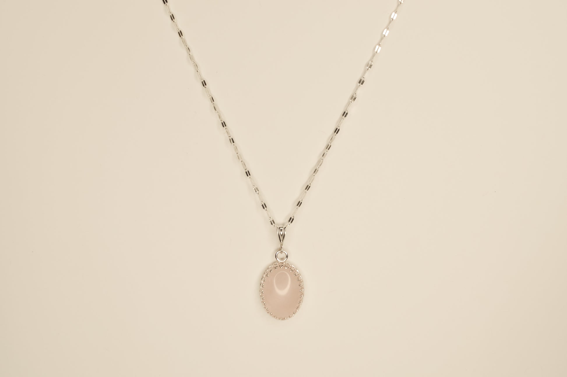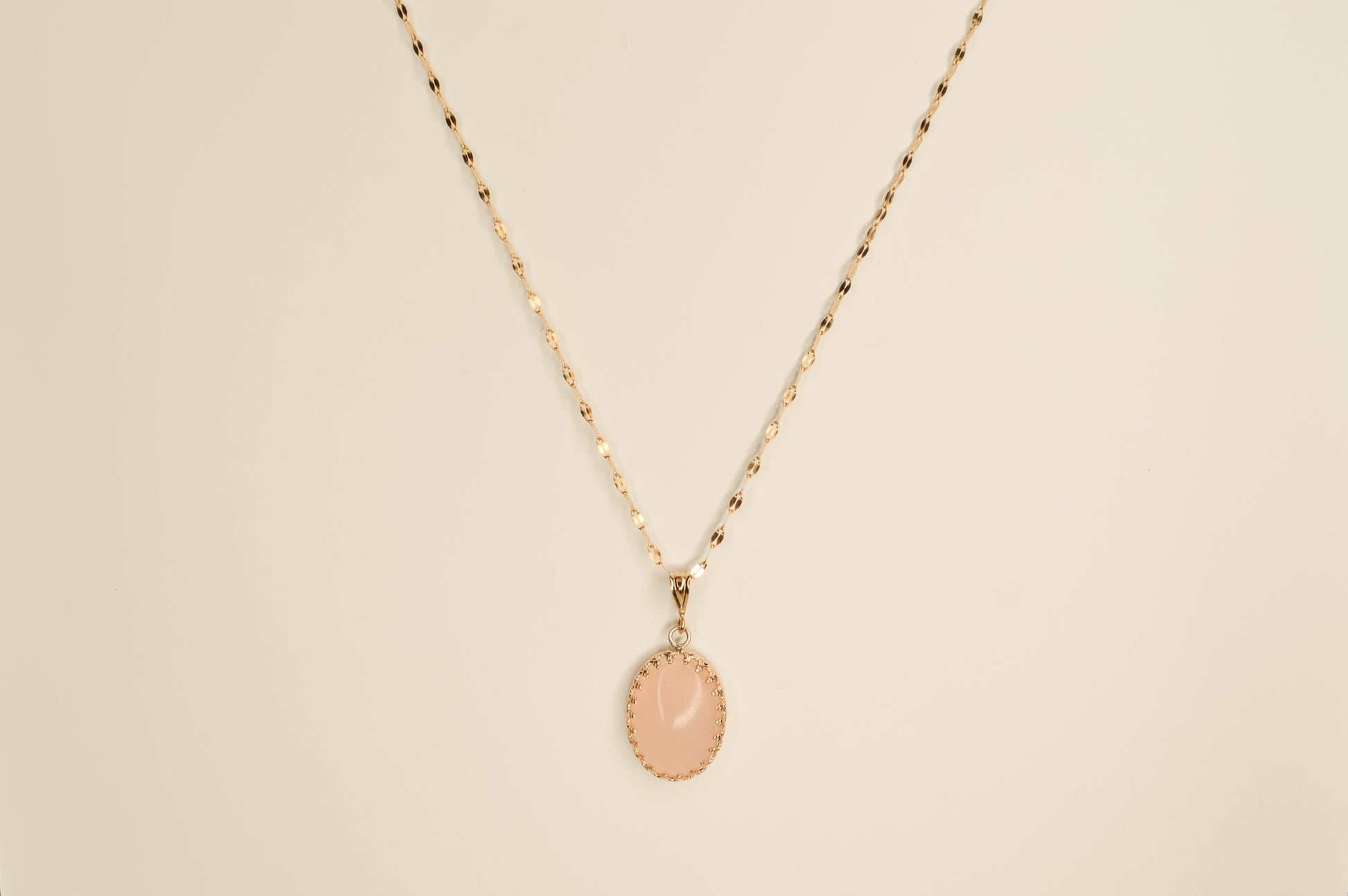 The rosy color of the rose quartz is a striking accessory to make you feel like a princess. The details are immaculate with a glistening chain to finish off the design.
